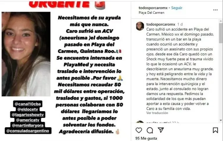Carolina Soledad Camaño, de 31 años, se encuentra actualmente hospitalizada en Playa del Carmen, México, tras sufrir un accidente cerebrovascular (ACV) mientras presenciaba un homicidio en la playa. La mujer, oriunda de Córdoba, Argentina, está internada en un hospital público, pero se requiere su traslado a otro centro médico para someterse a una operación urgente.