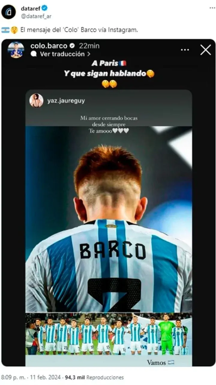 Aunque Barco no respondió directamente a las críticas, sí se expresó en las redes sociales. Reposteó una publicación de su novia, Yazmín Jaureguy, que mostraba una imagen suya con la camiseta de Argentina y escribía: "Mi amor cerrando bocas desde siempre. Te amooo". Barco añadió su propia firma al mensaje: "A París. Y que sigan hablando". Por lo pronto, se prepara para unirse a su nuevo club en los próximos días, donde buscará emular el éxito que tuvo en Boca Juniors y en las selecciones juveniles, con la mirada puesta en ganarse un lugar entre los 18 jugadores que viajarán a los Juegos Olímpicos en busca de la tercera medalla dorada de la historia para Argentina.