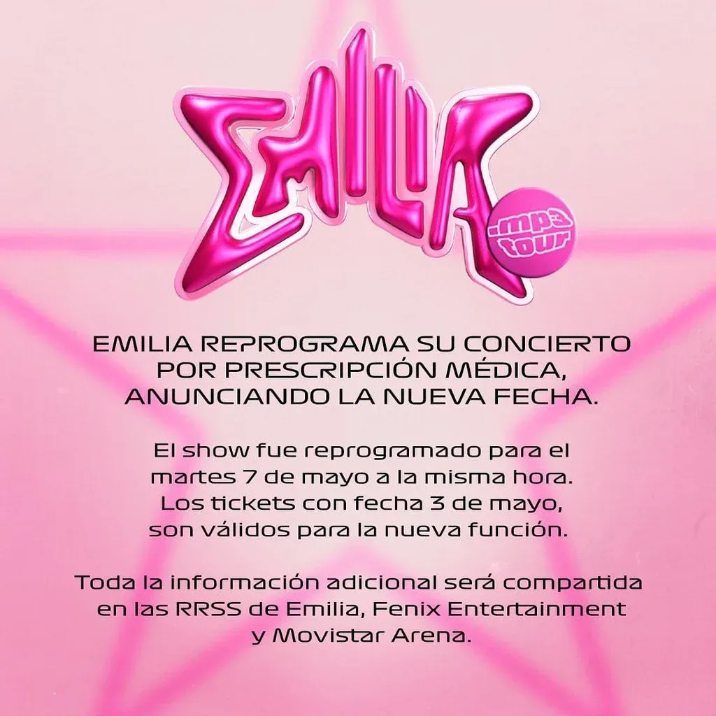 El comunicado sobre las fechas reprogramadas A pesar de este contratiempo, Emilia continúa con su gira ".MP3" en Buenos Aires, con tres presentaciones aún por delante. Su álbum .mp3 ha marcado un hito en su carrera como artista de pop urbano, alcanzando más de 3 billones de reproducciones en plataformas digitales y obteniendo reconocimientos como su participación en el "Festival Equal" de Spotify y su nominación a los Premios Los 40.