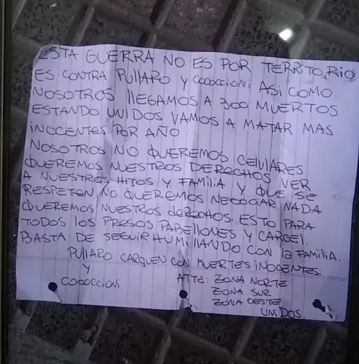 Este nuevo mensaje, que según se ve en la afirma: “Hasta que Pullaro no pare vamos a matar. Zona norte sur oeste. El que avisa no traiciona”, fue encontrado frente a la casa de una mujer en la zona norte de la ciudad y advierte que los ataques no cesarán. Además, se sospecha que el símbolo de un parlante tachado que tiene que ver con una cargada por parte de los hinchas de Newell's hacia los de Rosario Central.