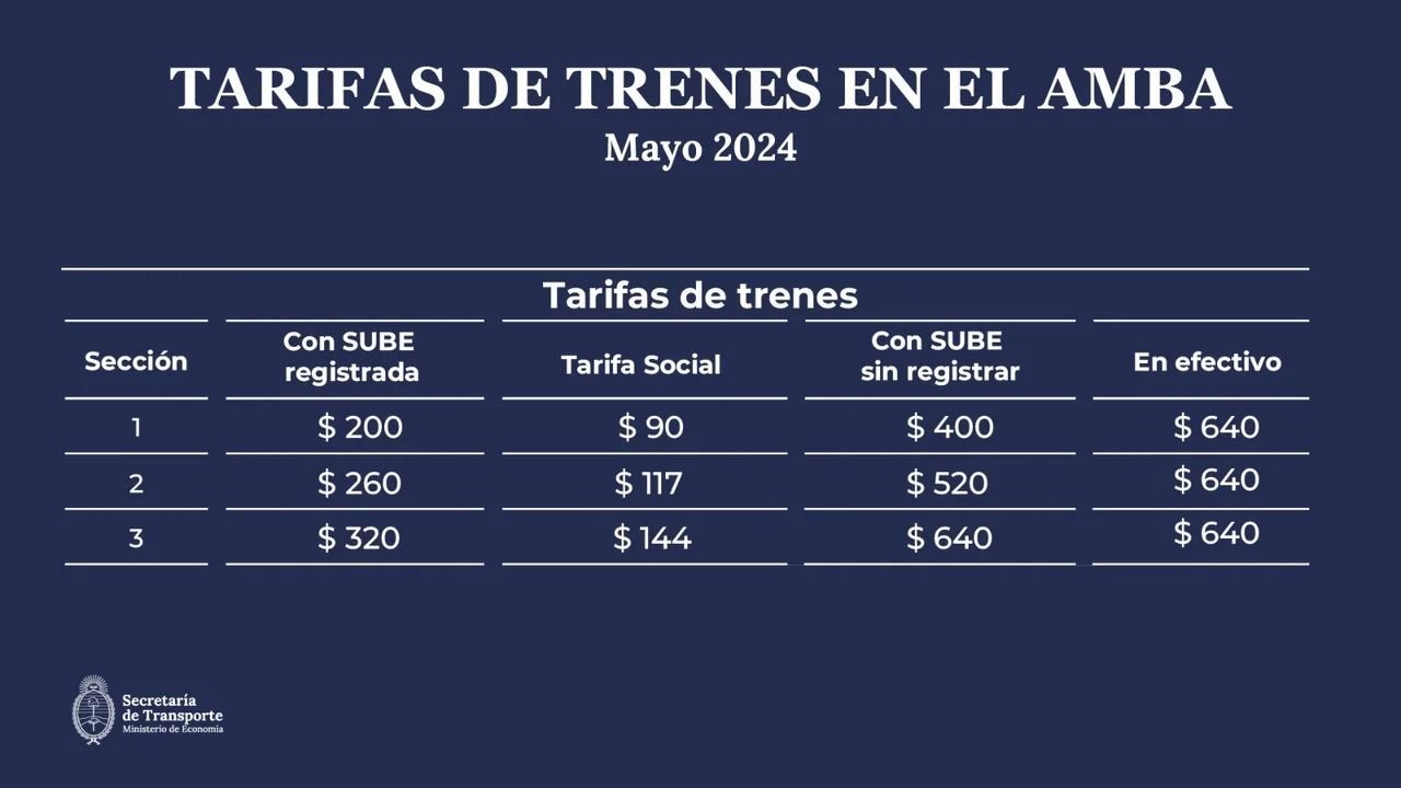 Con el comienzo del mes de mayo, volverá a aumentar el boleto de tren. El Gobierno de Javier Milei oficializó las nuevas tarifas de tren, que entrarán en vigencia a partir del 2 de mayo. Mediante la resolución 01/2024 publicada este lunes en el Boletín Oficial, la Secretaría de Transporte de la Nación estableció los siguientes precios para los servicios del Área Metropolitana de Buenos Aires (AMBA) y para trenes regionales y de larga distancia. El pasaje mínimo para los servicios metropolitanos pasará a valer $200, desde los $130 que vale hoy. Supone un aumento del 53% que se aplica también a los pasajes por tramos más largos.