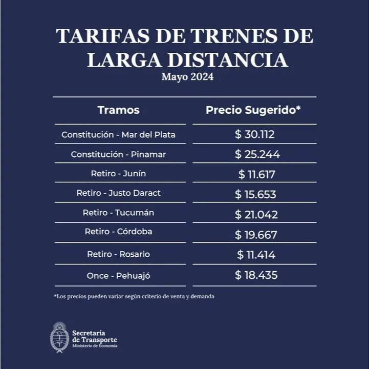 Al mismo tiempo se dispuso actualizar el cuadro tarifario de los trenes de larga distancia. En un comunicado de la Secretaría de Transporte se argumentó la decisión “con el objetivo de mejorar los coeficientes de explotación”, y se aclaró que los nuevos valores de referencia tendrán “un margen mínimo y máximo de variación tarifaria posible al momento de que salgan a la venta, y que son tenidos en cuenta por parte de Trenes Argentinos Operaciones para confeccionar los valores finales, según criterios comerciales de venta y demanda”.