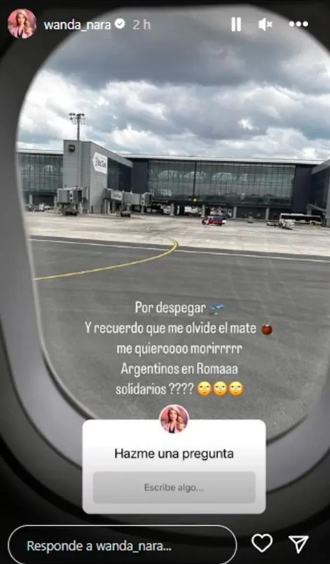 Cuando estaba en el aeropuerto de Estambul, Wanda compartió primero una imagen de los datos del vuelo en pantalla con el mensaje "A bailar". Minutos después, una vez arriba del avión, subió otra historia compartiendo un pequeño olvido que tuvo al salir apurada de casa.“Por despegar y recuerdo que me olvide el mate, me quiero morir. ¿Argentinos en Roma solidarios?”, preguntó.