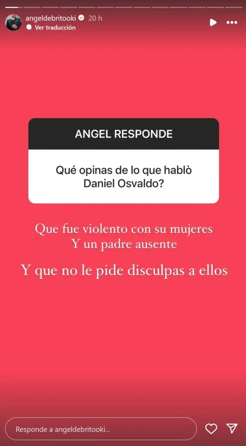 “¿Qué opinás de lo que habló Daniel Osvaldo?”, le consultaron. “Que fue violento con sus mujeres y un padre ausente. Y que no les pide disculpas a ellos...”, sentenció Ángel, muy crítico.