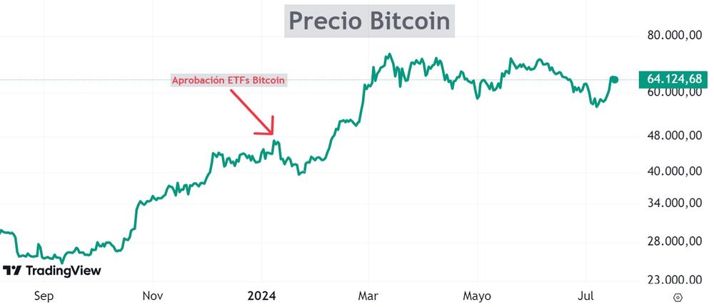 Los ETFs de Bitcoin se aprobaron en enero de este año y el precio cayó durante los primeros días. ¿Por qué? Recordemos el famoso adagio “comprar con el rumor, vender con la noticia”.