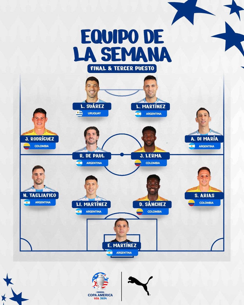 La Conmebol dio a conocer este lunes el equipo ideal de la última semana de la Copa América 2024, que incluyó el partido por el tercer y cuarto puesto que se jugó el sábado entre la selección de Uruguay y Canadá, y la gran final del domingo entre Argentina y Colombia.
