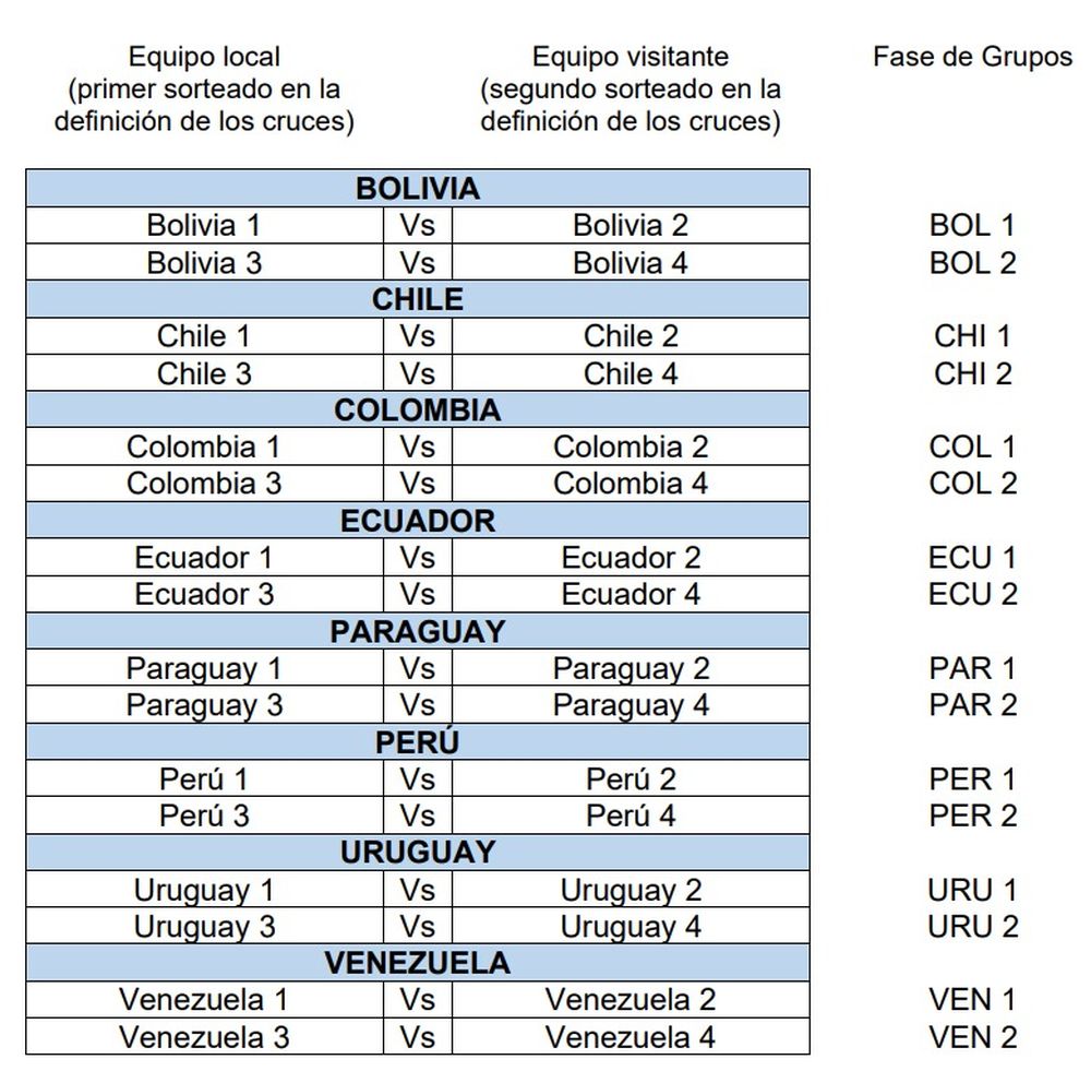 Para determinar los cruces de la Primera Fase será realizado un sorteo entre los 4 representantes de cada país para definir los cruces nacionales.