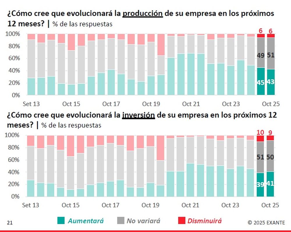 El 43% de los consultados prevé aumentar la producción y una proporción similar (41%) planea incrementar la inversión en 2026. Sin embargo, cerca de la mitad no espera cambios, lo que es consistente con un escenario de bajo crecimiento económico, según Exante.