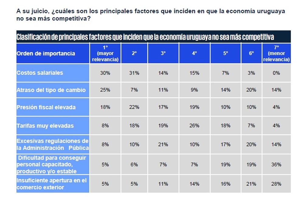Al analizar los factores que afectan la competitividad, los costos salariales son señalados como el elemento más relevante, seguidos por el atraso del tipo de cambio y la presión fiscal. Otros factores mencionados son las tarifas públicas, las regulaciones de la administración pública, la dificultad para conseguir personal capacitado y la apertura al comercio exterior.