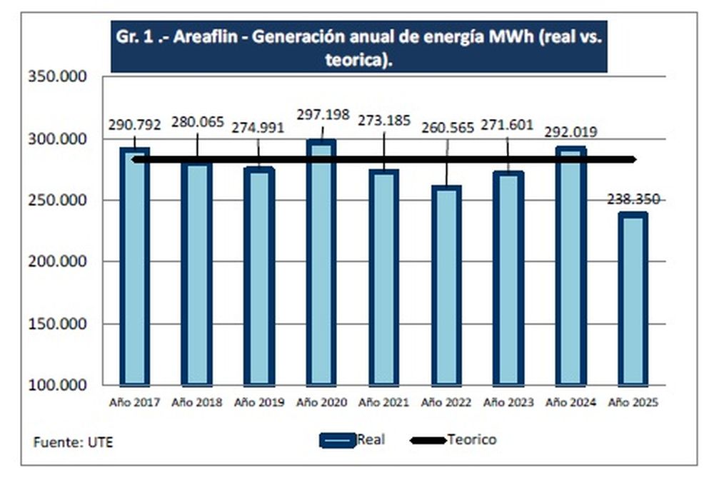 El parque eólico Arias, ubicado en Flores y operativo desde mediados de 2017, registró en 2025 su menor nivel de producción desde la puesta en marcha. La generación se ubicó un 13,6% por debajo de la estimación P50 ajustada en 2021 por la consultora Barlovento, aunque el promedio histórico se mantiene un 4,6% por debajo de lo teórico.