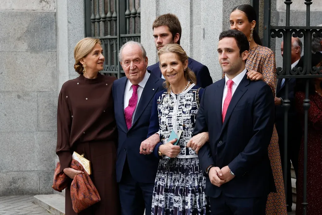 El otro gran protagonista del enlace ha sido el rey emérito, que tanto al entrar como al salir ha sido vitoreado por los ciudadanos, y al abandonar el templo ha posado junto a las infantas Cristina y Elena y sus nietos Juan Valentín, Felipe Juan Froilán y Victoria Federica mientras se oía "viva el rey" y "viva España".