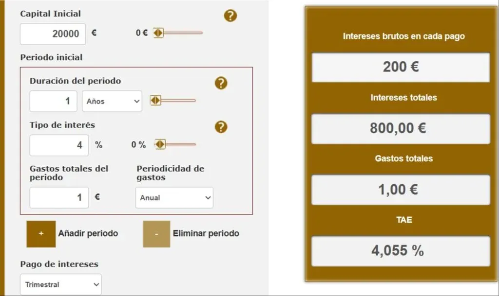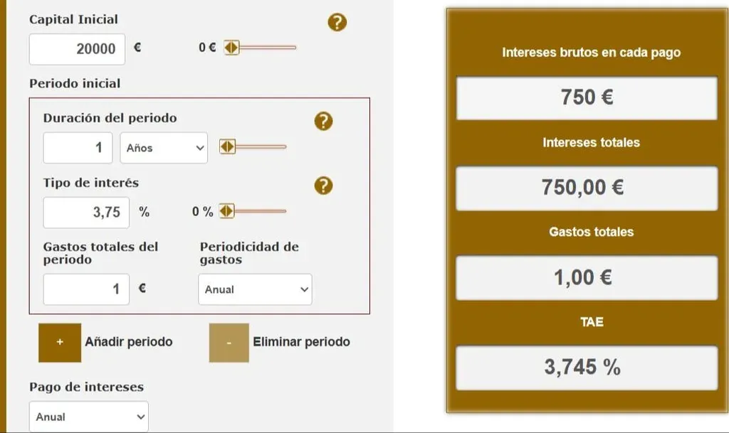 Si decides realizar tu depósito a plazo fijo en esta entidad bancaria. Suponiendo a modo de ejemplo, como se mencionó antes que tomas la opción de invertir 20.000 euros, en un año tendrás una ganancia bruta de 750 euros.