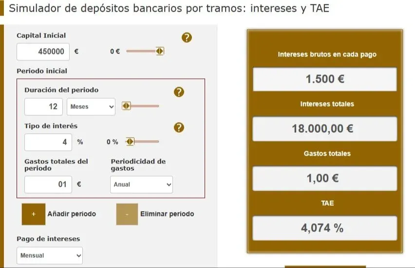 Para explicarlo mejor, utilizamos este simulador de depósitos a plazo fijo para que no solo leas, sino también puedas entender cómo y cuánto ganarás realmente con esta inversión. Si la idea es ganar 1500 euros de manera mensual, el monto que hay que invertir en el BCE es de 450.000 euros con un contrato de 12 meses y una periodicidad de gastos anuales, lo que hará que se pague uno solo necesariamente. Cuando el año finalice tendrás tus 450.000 euros más una suma de 18.000 euros más debido al crecimiento de este 4% mencionado.