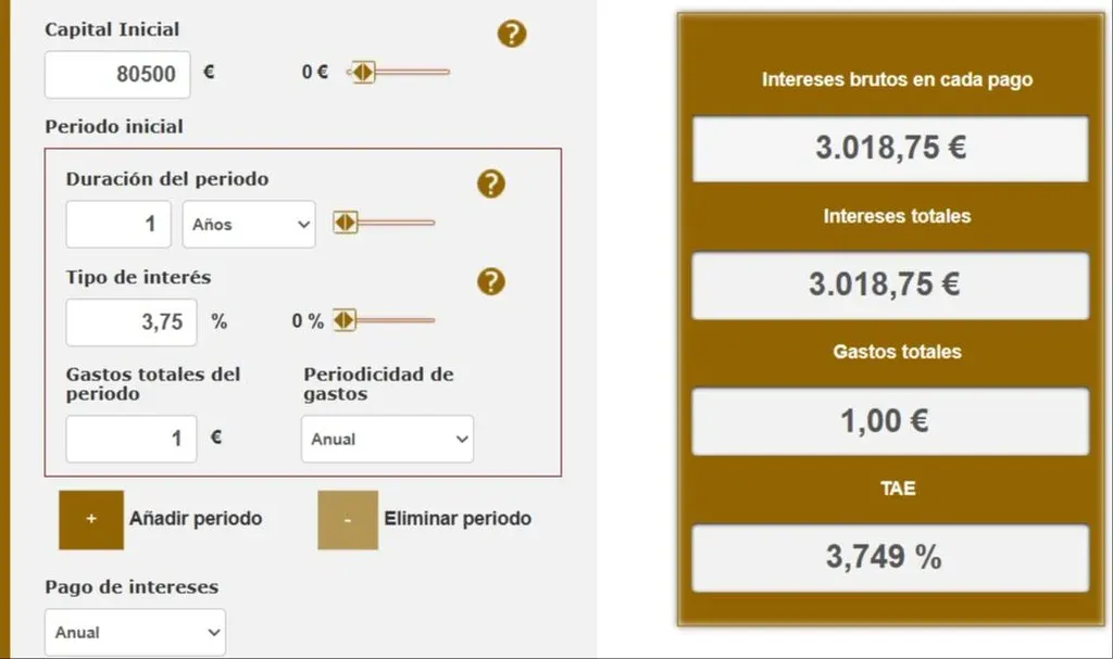 Si optas por Banco Big y deseas ganar 3000 euros, deberás invertir un monto ligeramente mayor. Con un depósito de 80,500 euros en Banco Big, acumularás un total de 3018 euros en ganancias al finalizar el plazo.
