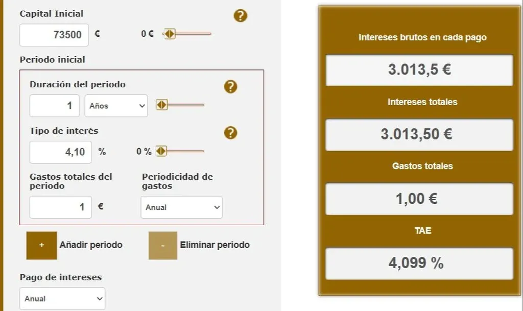 Entonces, si deseas obtener 3000 euros de ganancia al finalizar el plazo de los 12 meses, de la mano del simulador de depósitos del Banco de España te mostraremos cuánto deberás invertir en el depósito a plazo fijo mencionado. Como verás en la imagen previa, la inversión necesaria sería de 73.500 euros en el depósito de Haitong Bank, para lograr acumular un total de 3013 euros en ganancias en 1 año.