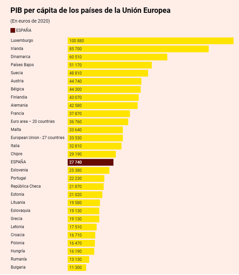 Ajustada por inflación, la renta per cápita de España es de 27.740 euros contra 33.530 del bloque comunitario.
