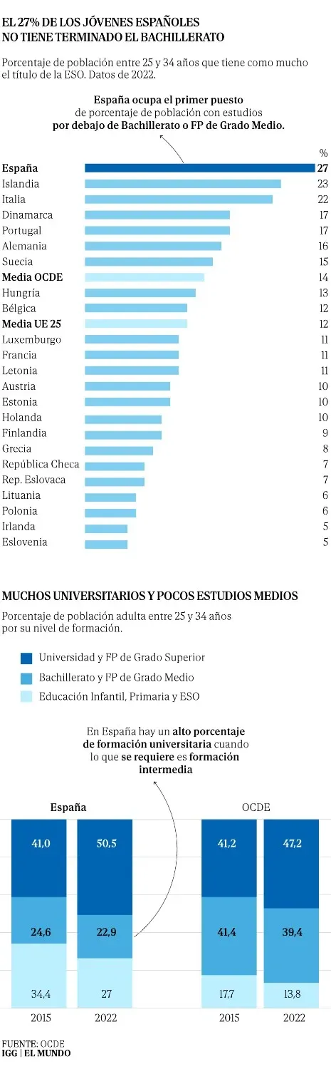 España es el país de la Unión Europea (UE) con mayor proporción de jóvenes de entre 25 y 35 años que no tienen terminados los estudios de Bachillerato o su equivalente de FP de Grado Medio.