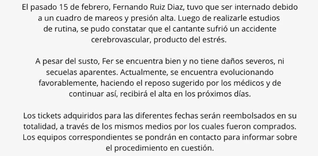 A pesar de la mejoría y el buen pronóstico, señalaron que Fernando Ruíz Díaz no está en condiciones de retomar la gira por tiempo indeterminado, hasta poder asegurar una plena recuperación.