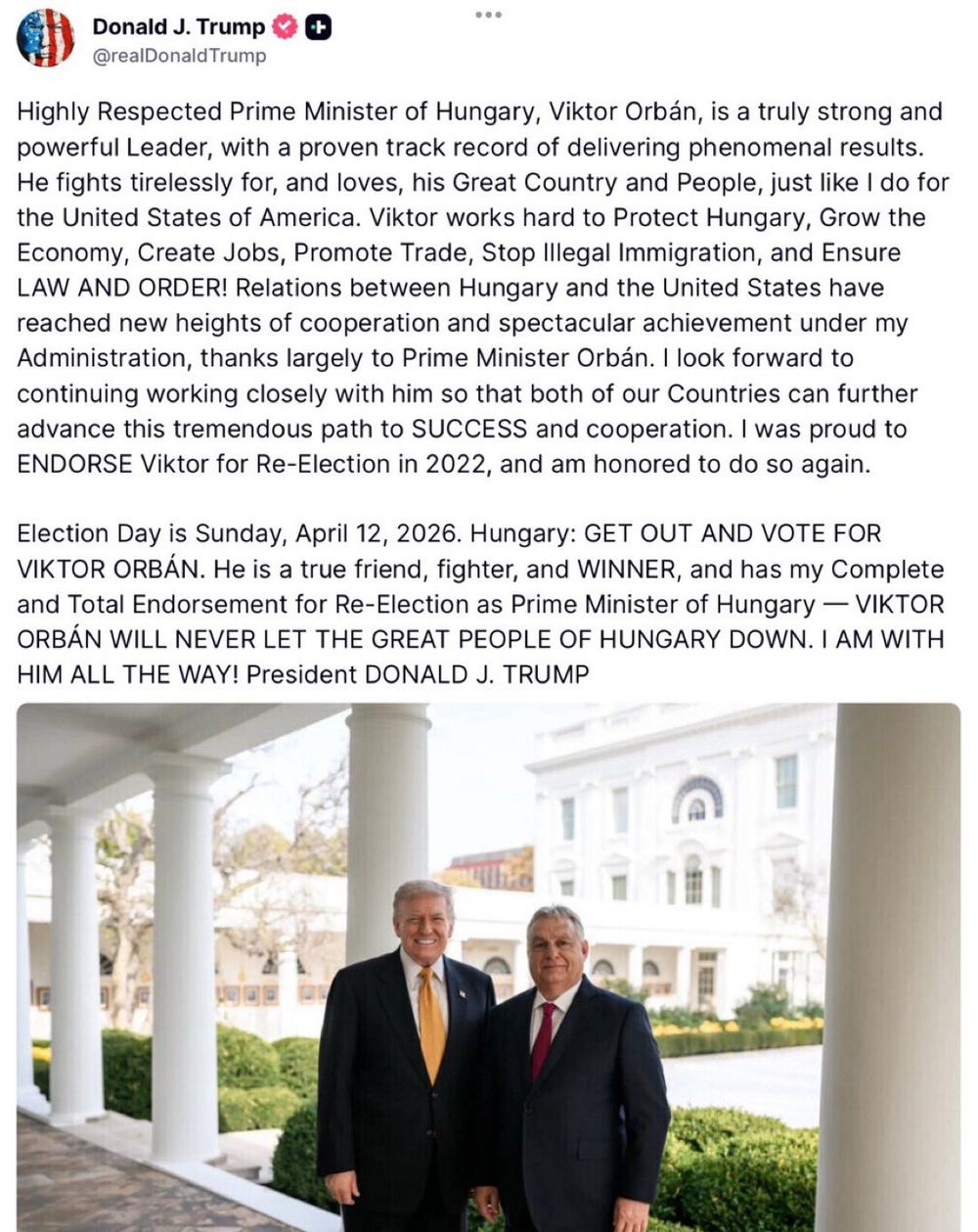 En un movimiento que refuerza el eje conservador transatlántico, el presidente de Estados Unidos, Donald Trump, ha expresado este jueves su apoyo "total y absoluto" al primer ministro de Hungría, Viktor Orbán. A través de un mensaje en sus redes sociales, el mandatario estadounidense ha instado a la ciudadanía húngara a votar por la reelección de Orbán en los comicios que se celebrarán este domingo, 12 de abril.