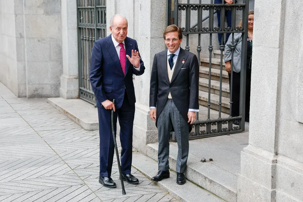 El alcalde de Madrid, José Luis Martínez-Almeida (d), saluda al rey emérito Juan Carlos I este sábado a las puertas de la iglesia de San Francisco de Borja de Madrid antes de contraer matrimonio con Teresa Urquijo.