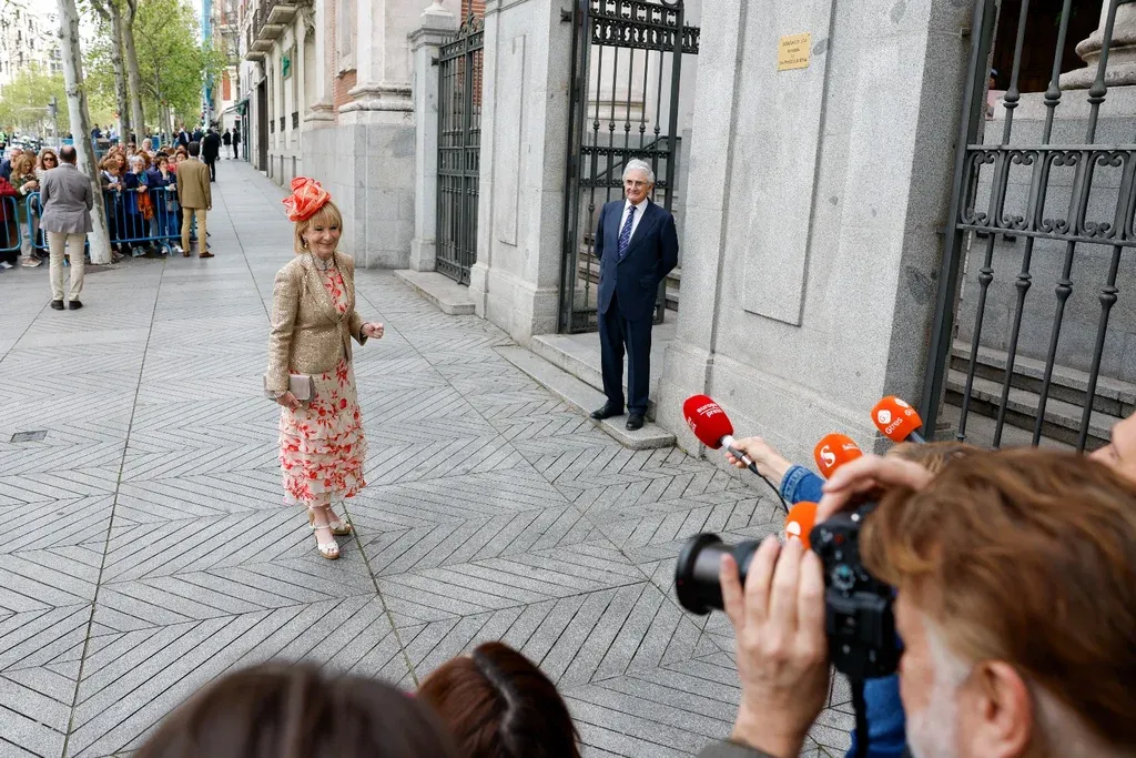 La secretaria general del PP, Cuca Gamarra (2d), a su llegada a la boda del alcalde de Madrid, José Luis Martínez-Almeida, y la sobrina segunda del Rey Felipe VI, Teresa Urquijo.