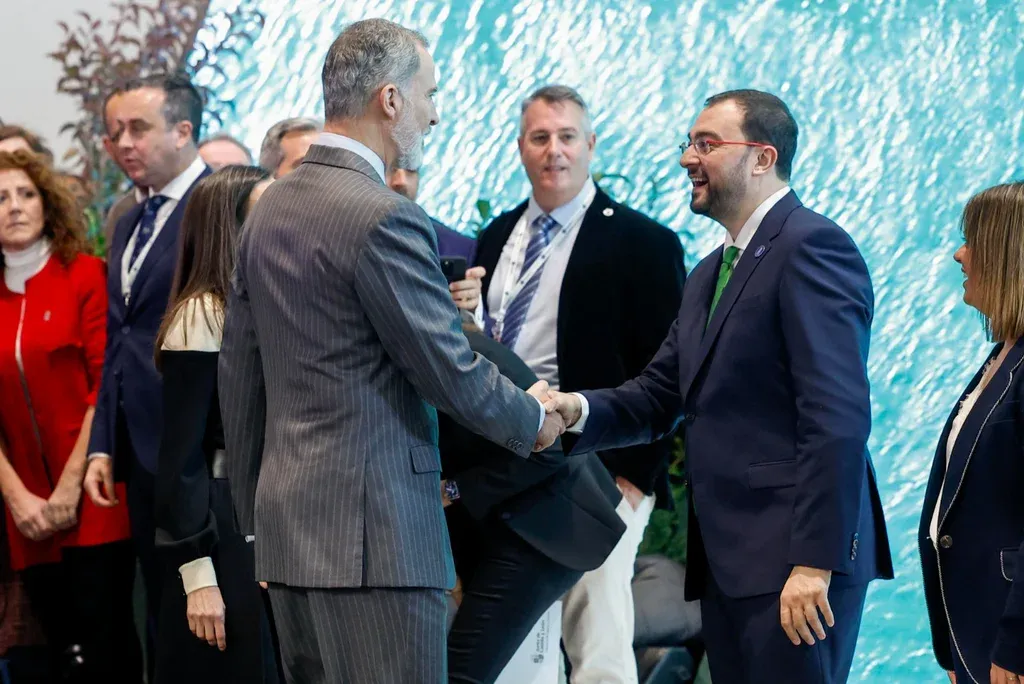 El rey Felipe saluda al presidente de Asturias, Adrián BArbón (d)en el stand del Asturias tras inaugurar Fitur 2024 en Ifema, Madrid este miércoles.