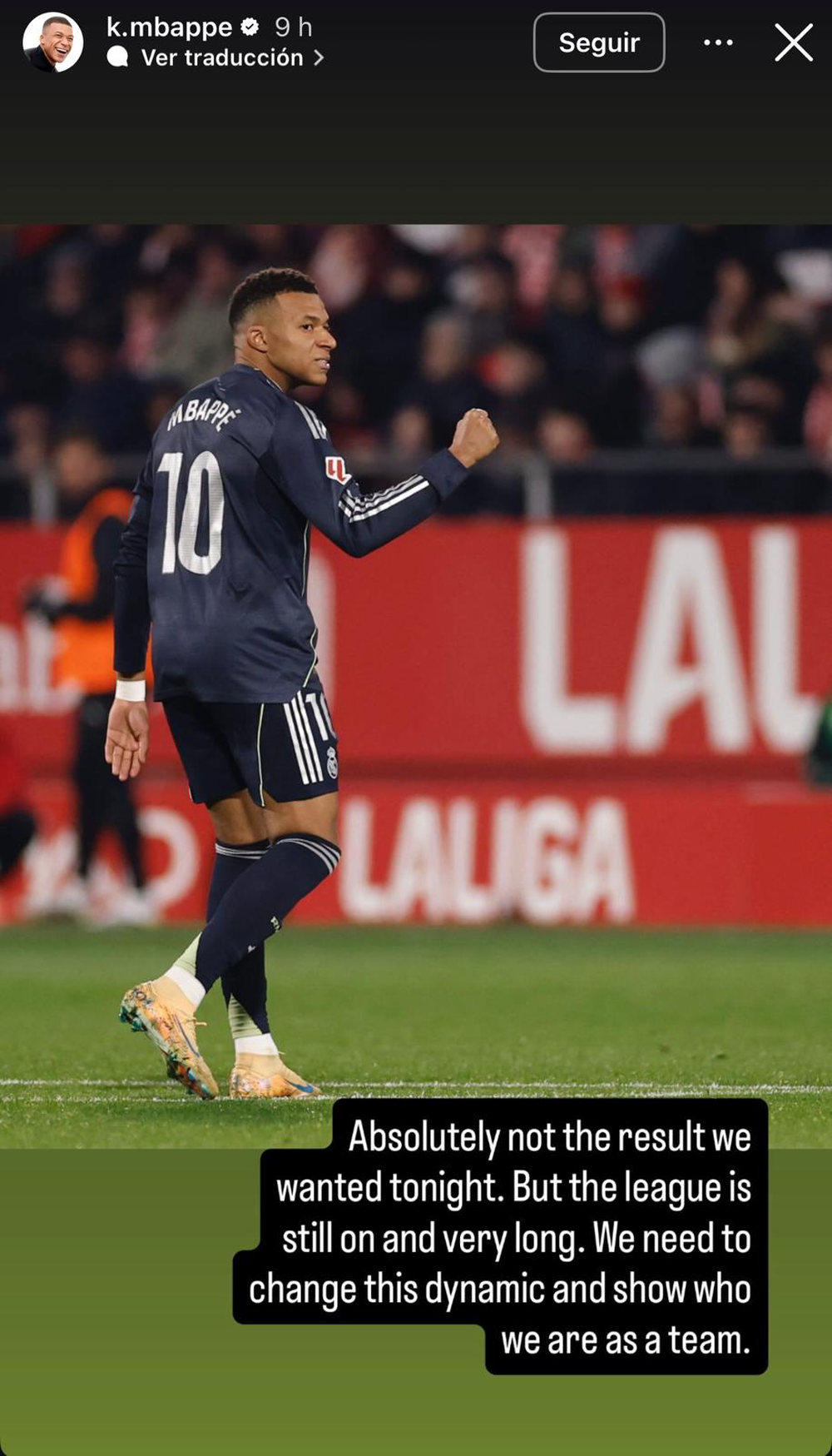 "No es el resultado que queríamos esta noche. Pero la liga sigue y es muy larga", compartió Mbappé con sus más de 128 millones de seguidores en Instagram.