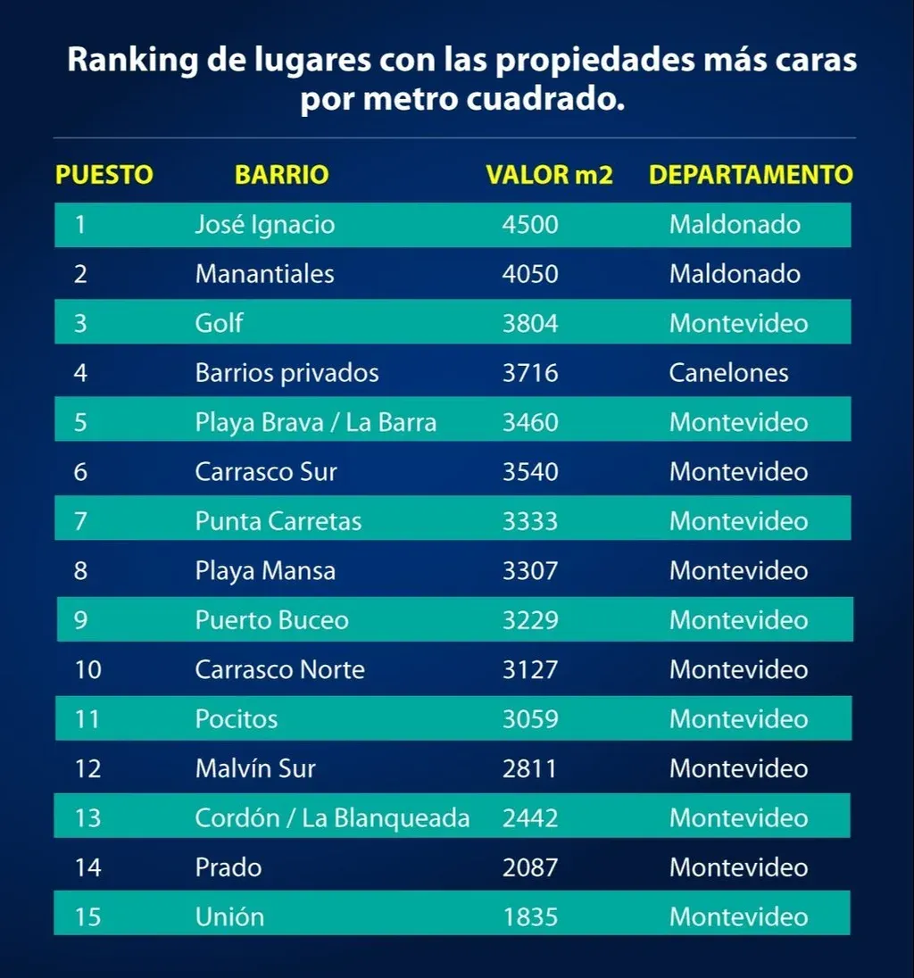 En la cima el pueblo José Ignacio, en el departamento de Maldonado, presenta un costo de US$ 4.500 el m2 y es el lugar con el m2 más elevado de Uruguay. Además, en este sitio de la costa este “las propiedades pueden llegar a tener un costo de US$ 6 mil (m2) tranquilamente”, detalló el analista de datos del portal inmobiliario InfoCasas, Diego Eizmendi.