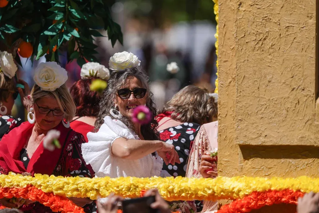 La Batalla de las Flores, organizada por la Federación de Peñas Cordobesas, ha reunido a miles de personas al paso de las trece carrozas ocupadas por mujeres vestidas de flamenca y hombres ataviados de corto, acompañados de música y canciones mientras han lanzado las flores, fundamentalmente claveles, a las personas que los saludan a su paso.