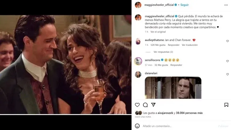 "El mundo te echará de menos, Matthew Perry. La alegría que trajiste a tantos en tu corta vida seguirá viva. Me siento muy bendecida por cada momento creativo que compartimos", publicó en sus redes Maggie Wheeler, quien hizo el papel de Janice, novia de Chandler en "Friends".