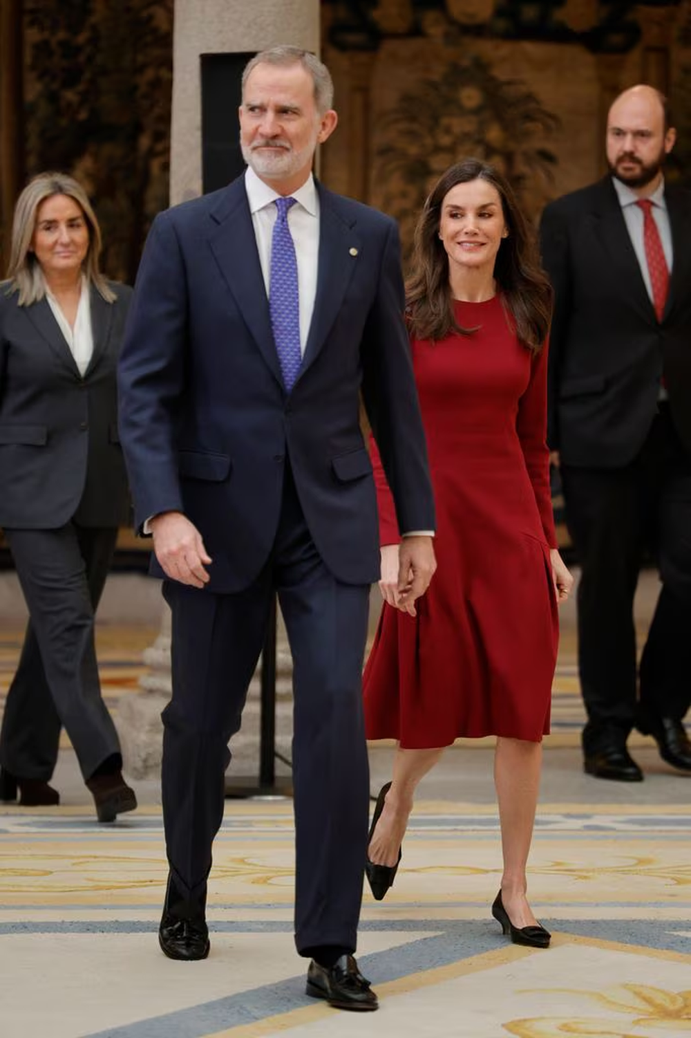 Es tradición que Letizia vista de rojo en este tipo de actos y ese “guiño patrio” volvió a repetirse. En esta ocasión eligió un diseño midi de Carolina Herrera, perfecto para la ocasión y además repetido: lo estrenó hace unos años durante un viaje oficial a Reino Unido.
