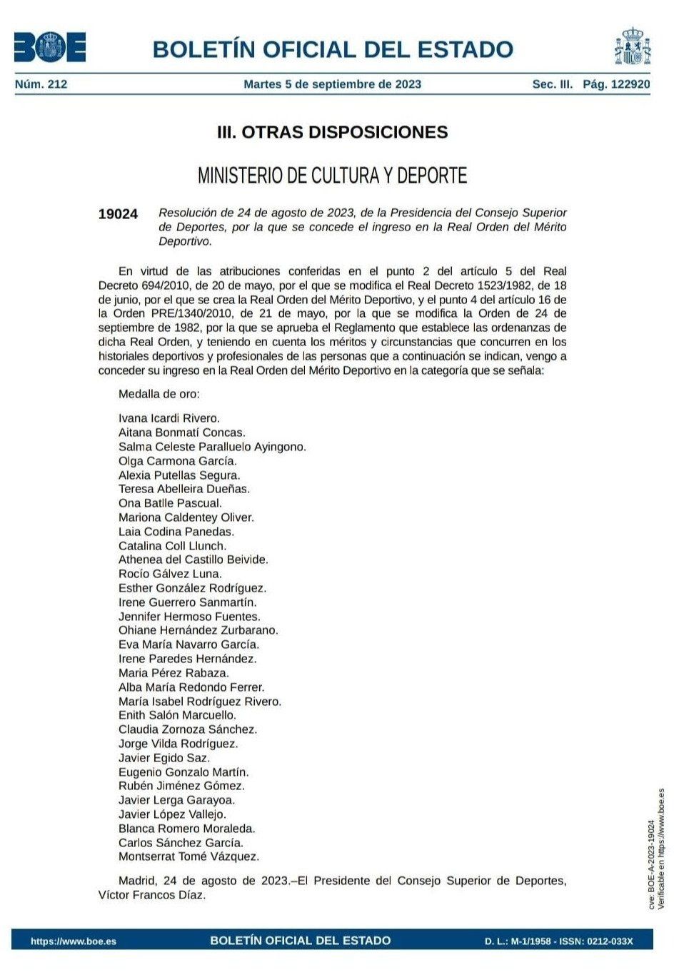El Gobierno se confundió a Ivana Andrés, capitana de la selección española femenina y reciente campeona del mundo, con Ivana Icardi, influencer argentina y hermana del futbolista Mauro Icardi, a la hora de publicar en el Boletín Oficial del Estado la lista de jugadoras que iban a recibir la medalla  al Mérito Deportivo por su hazaña en el Mundial.
