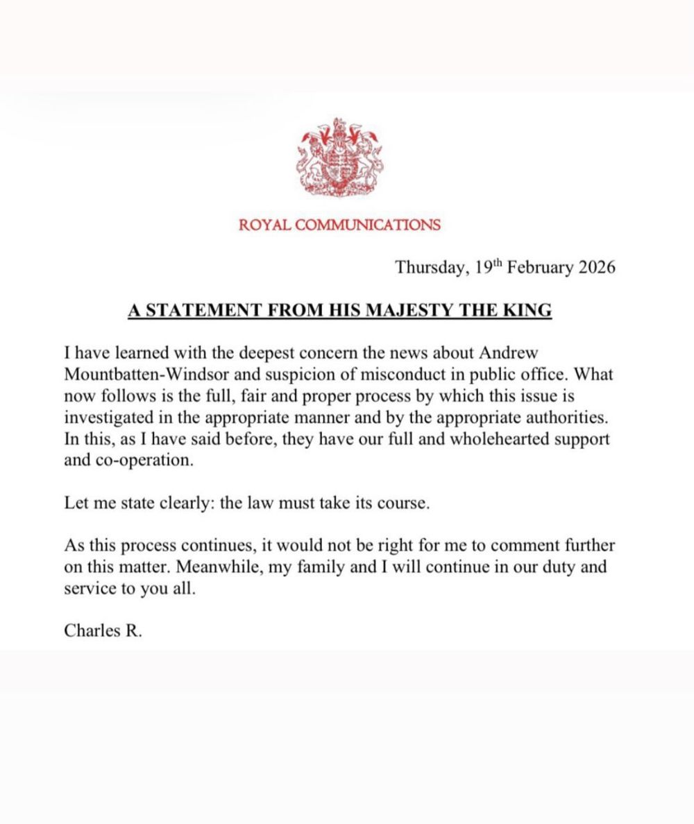 El rey difundió un comunicado en el que expresó "su más profunda preocupación" por la detención de su hermano, el ex príncipe Andrés, vinculado al caso Epstein