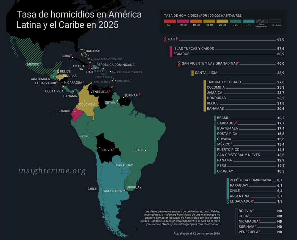 La tasa de homicidios registró una disminución en América Latina y el Caribe en 2025, reveló un informe de InSight Crime. La organización, especialista en crimen organizado y seguridad en la región, advirtió de todos modos que en países como Ecuador y Haití la violencia recrudeció de manera notable.