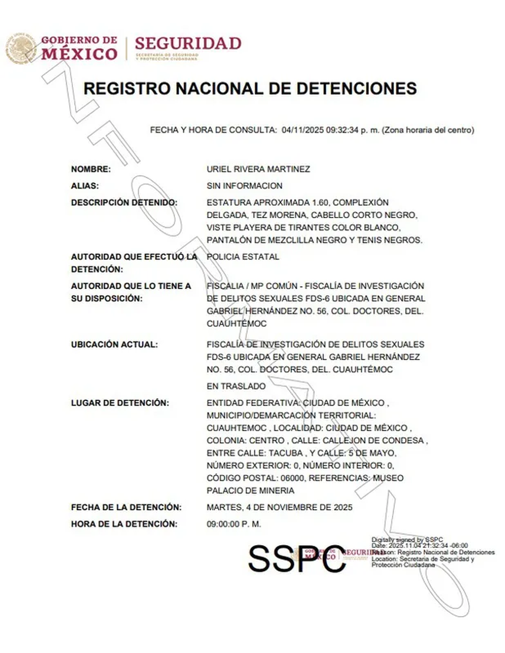 De acuerdo a la información publicada por el periódico Milenio, con base en el Registro Nacional de Detenciones, el detenido fue identificado como Uriel "N". Se encuentra sujeto a disposición del Ministerio Público y alojado en la Fiscalía de Investigación de Delitos Sexuales en la colonia Doctores, alcaldía Cuauhtémoc.