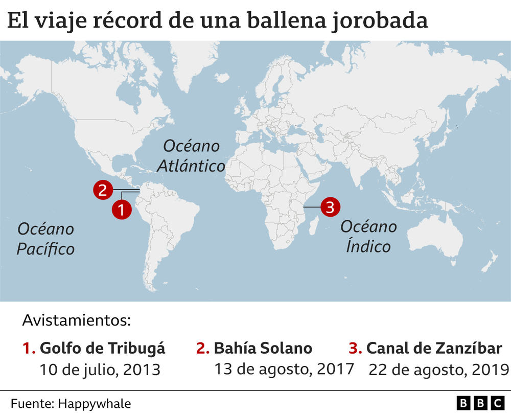 La ballena fue avistada en el Océano Pacífico frente a la costa de Colombia en 2017 y apareció varios años después cerca de Zanzíbar en el Océano Índico, a una distancia de al menos 13.000 km.