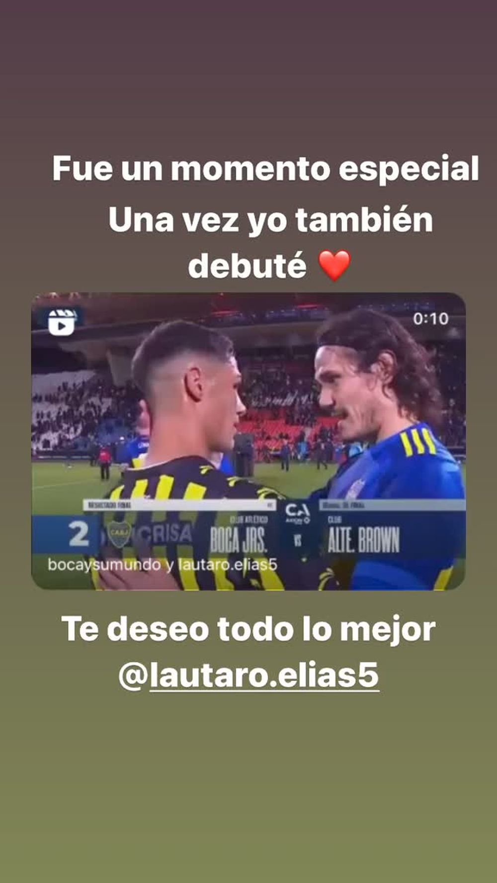 El jueves pasado Boca Juniors le ganó 2-1 a Almirante Brown por la Copa Argentina. Al final del partido, Edinson Cavani le dio su camiseta a Lautaro Elías de Almirante Brown y mientras se la entregaba le preguntó: "¿Vos me podés dar la tuya". El futbolista juvenil le respondió: "Debuté hoy". Cavani, que entendió la respuesta, la abrazó paternalmente, y este sábado le mandó un mensaje en redes sociales.