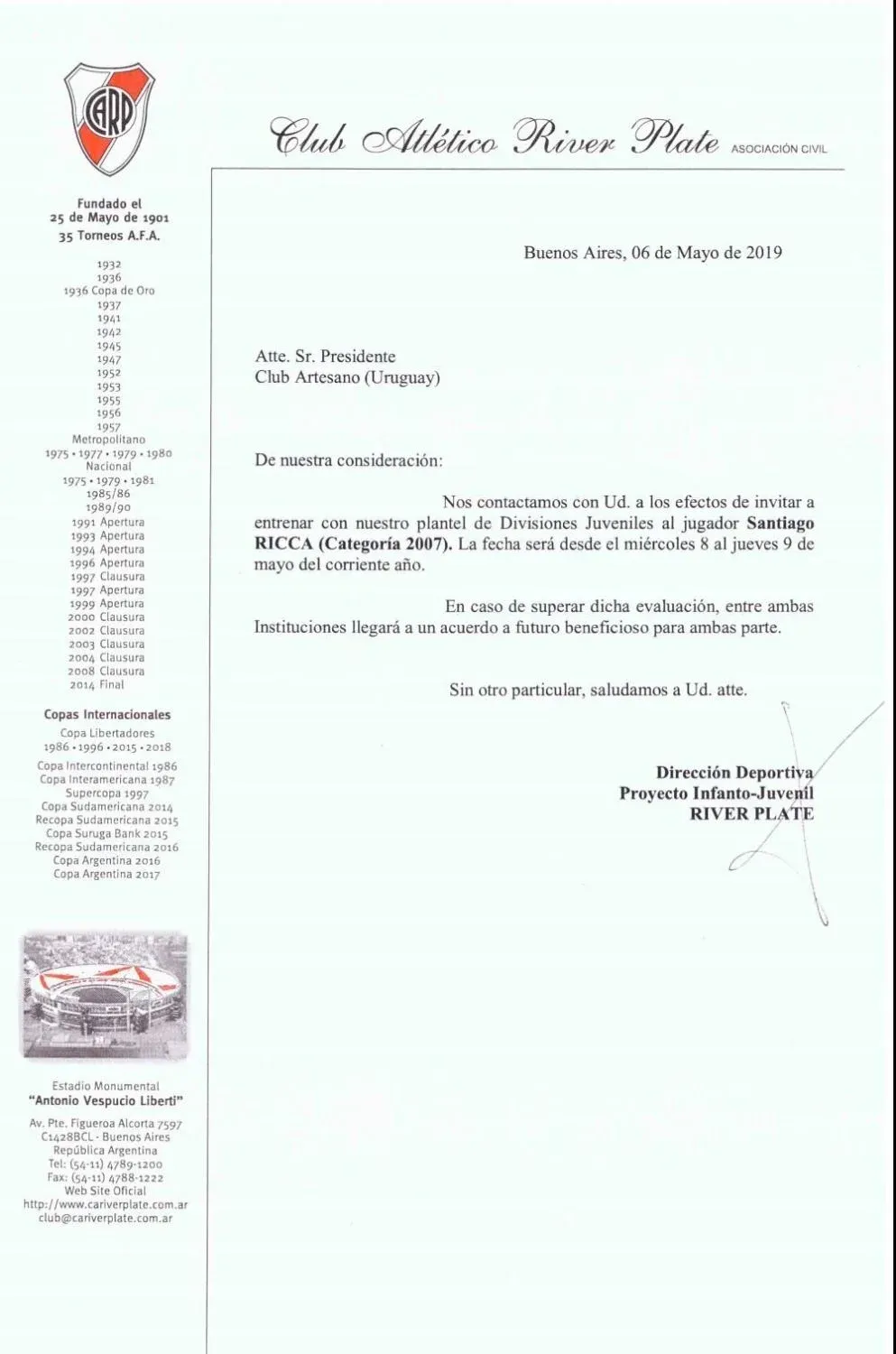 El 6 de mayo llegó una carta a Artesano pidiendo autorización para que el chiquilín fuera a probarse a Buenos Aires.