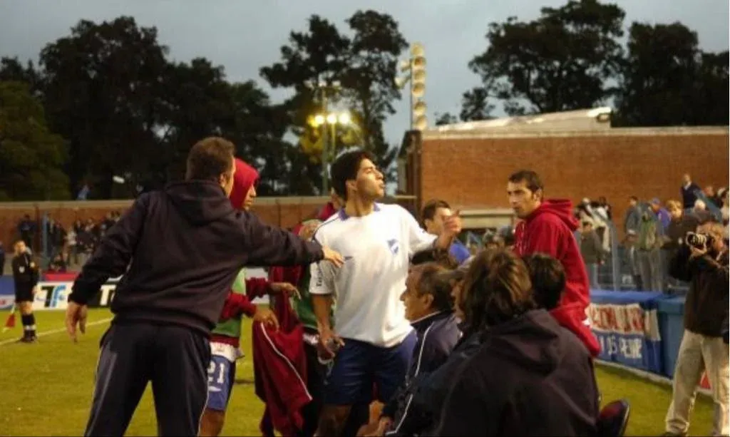 Martín Lasarte como técnico de Nacional en su primer pasaje por el club, tratando de calmar a Luis Suárez quien se molestó por los insultos de parte de los hinchas en el Gran Parque Central