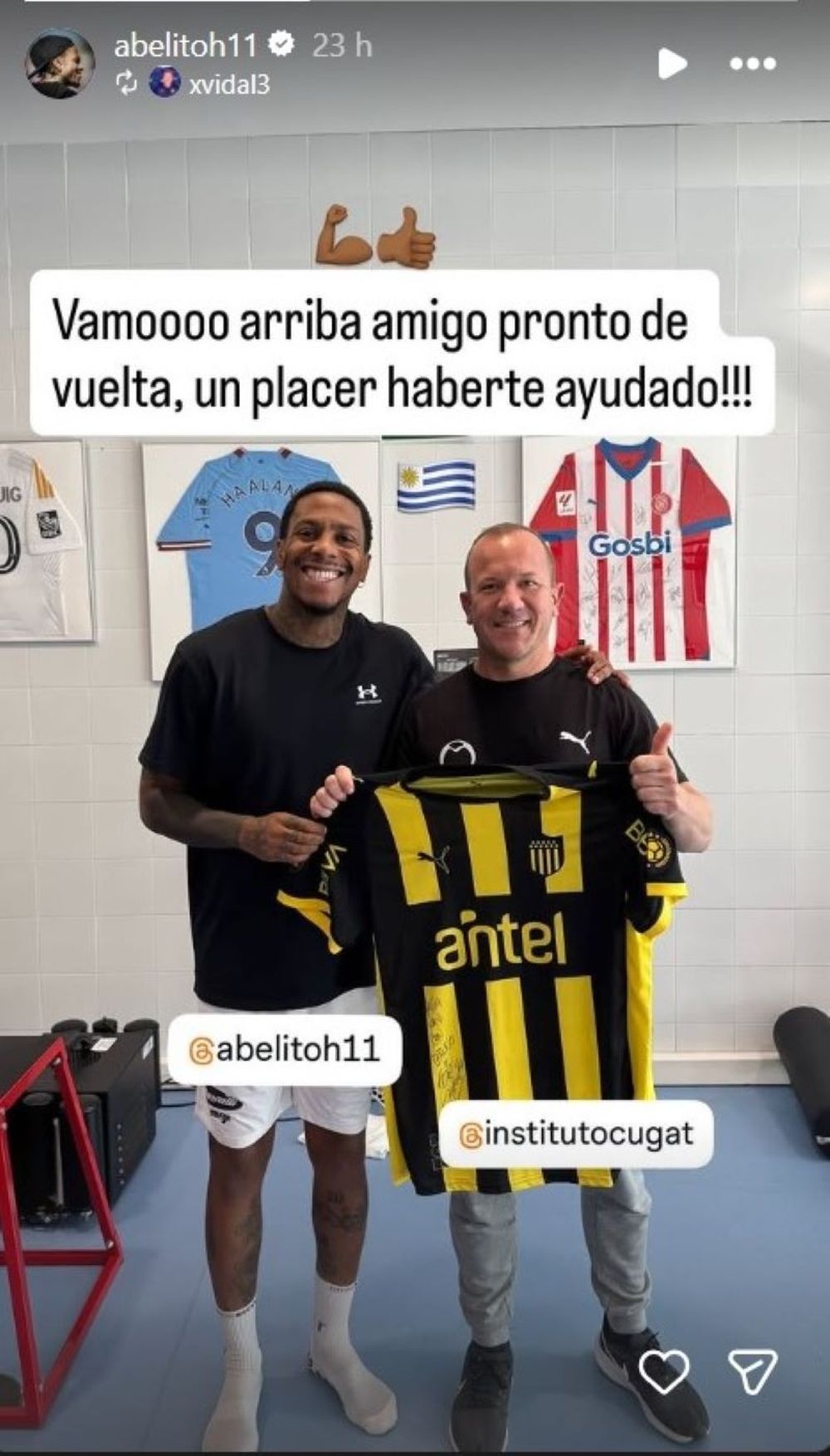 Abel Hernández posteó este sábado a en su cuenta de Instagram una historia con un ayudante del Instituto Cugat.