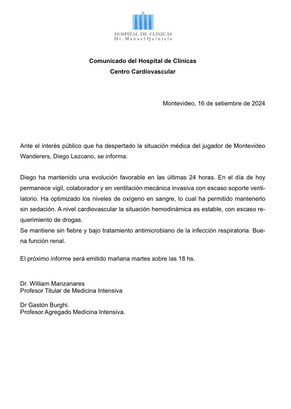 El Centro Cardiovascular del Hospital de Clínicas publicó el lunes un nuevo informe médico sobre la situación del futbolista de la tercera división de Wanderers, Diego Lezcano. El jugador nacido en Minas fue internado hace una semana como consecuencia de una arritmia, que luego derivó en una infección respiratoria que lo llevó a ingresar al CTI.