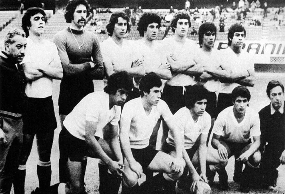 El equipo de Uruguay campeón juvenil en 1975; abajo, al lado de Carrasco, aparece Hebert Revetria, quien sería el goleador del certamen