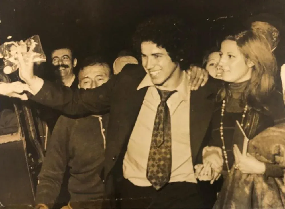 Hebert Revetria sonriente, recién llegado al aeropuerto de Carrasco tras ser campeón juvenil con Uruguay en 1975; junto a él, Gabriela, su esposa