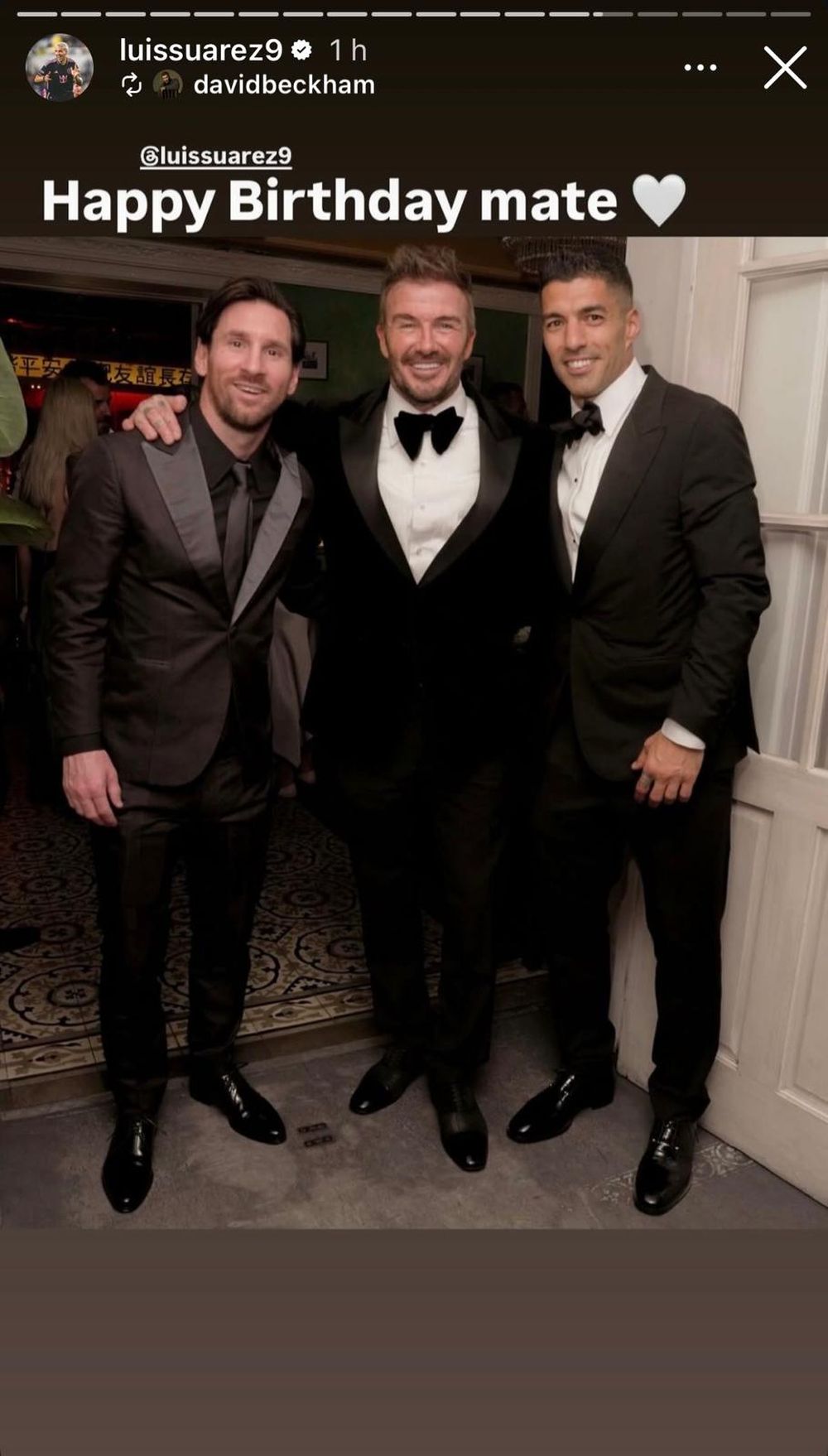 La leyenda inglesa y actual propietario del Inter Miami, David Beckham, también le dedicó una historia en su Instagram. "Happy birthday mate", escribió el exjugador del Manchester United y el Real Madrid, junto a una foto en la que está junto al uruguayo y Lionel Messi.