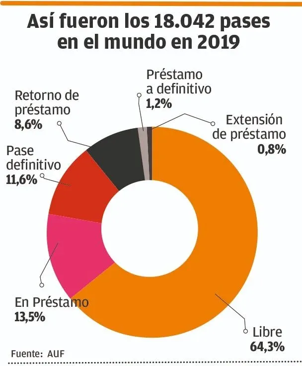 También el detalle del mercado de pases de 2012 a 2019 destaca que 64,3% de las transferencias son de jugadores sin contrato, 13,5% en préstamo, 11,6% operaciones finales.