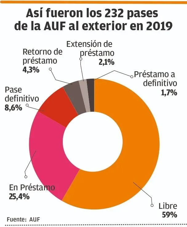 En comparación con Uruguay, en 2019, 59% de los pases fueron de jugadores sin contrato, 25,4% en préstamo y 8,6% definitivo.
