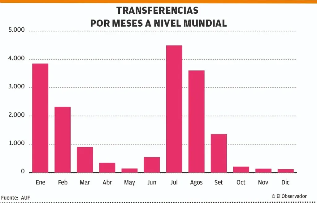 A nivel mundial se mantiene la misma lógica con picos de transferencias en enero-febrero y julio-agosto.