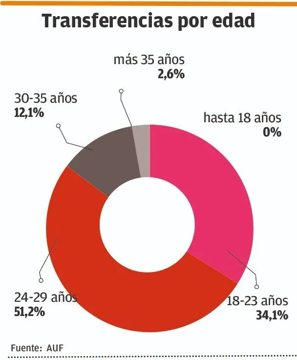 El otro detalle que arrojó el mercado de pases de 2019, es que el 85% de los futbolistas uruguayos que emigran tienen entre 18 y 29 años. Además, se desprende que al franja de uruguayos que más emigran es de los 24 a los 29 años, que concentra la mitad de las transferencias.