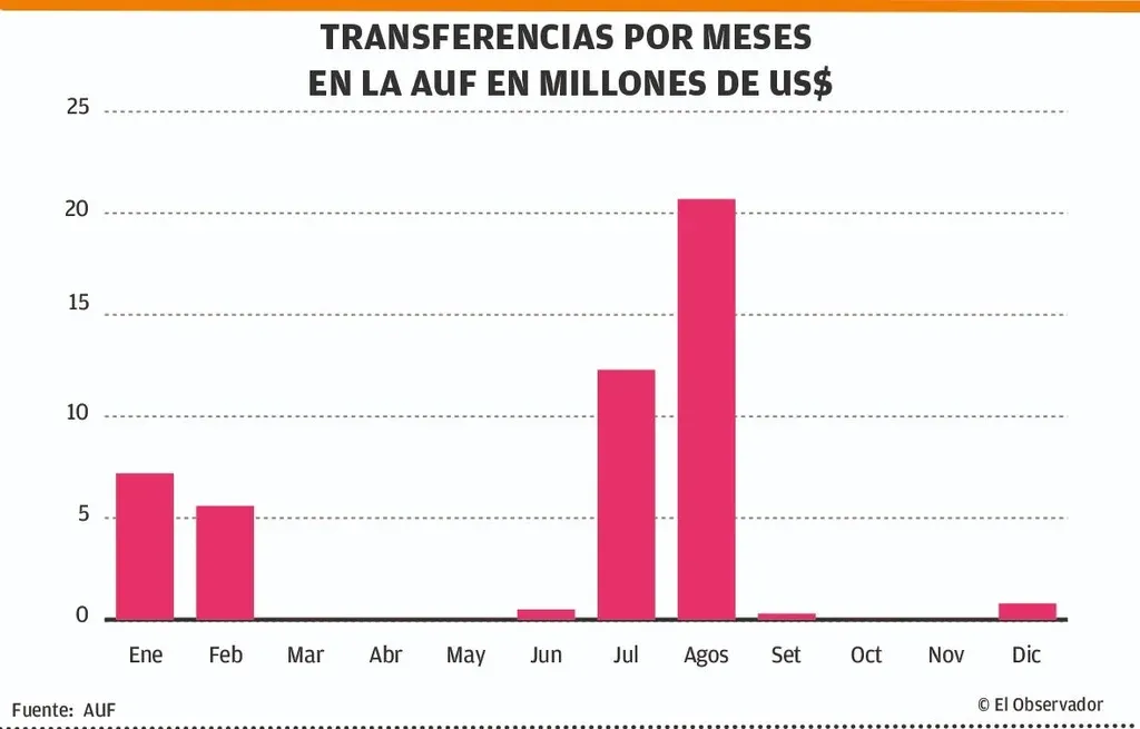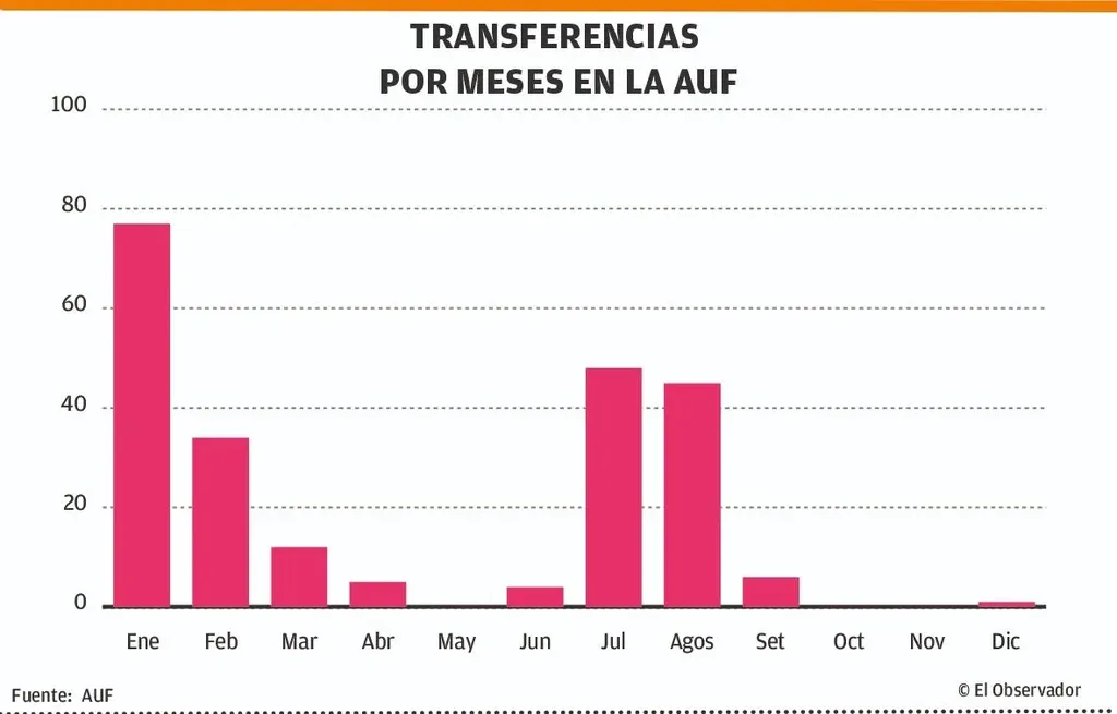 El fútbol uruguayo tiene dos picos de ingresos por transferencias, el de enero-febrero y julio-agosto.