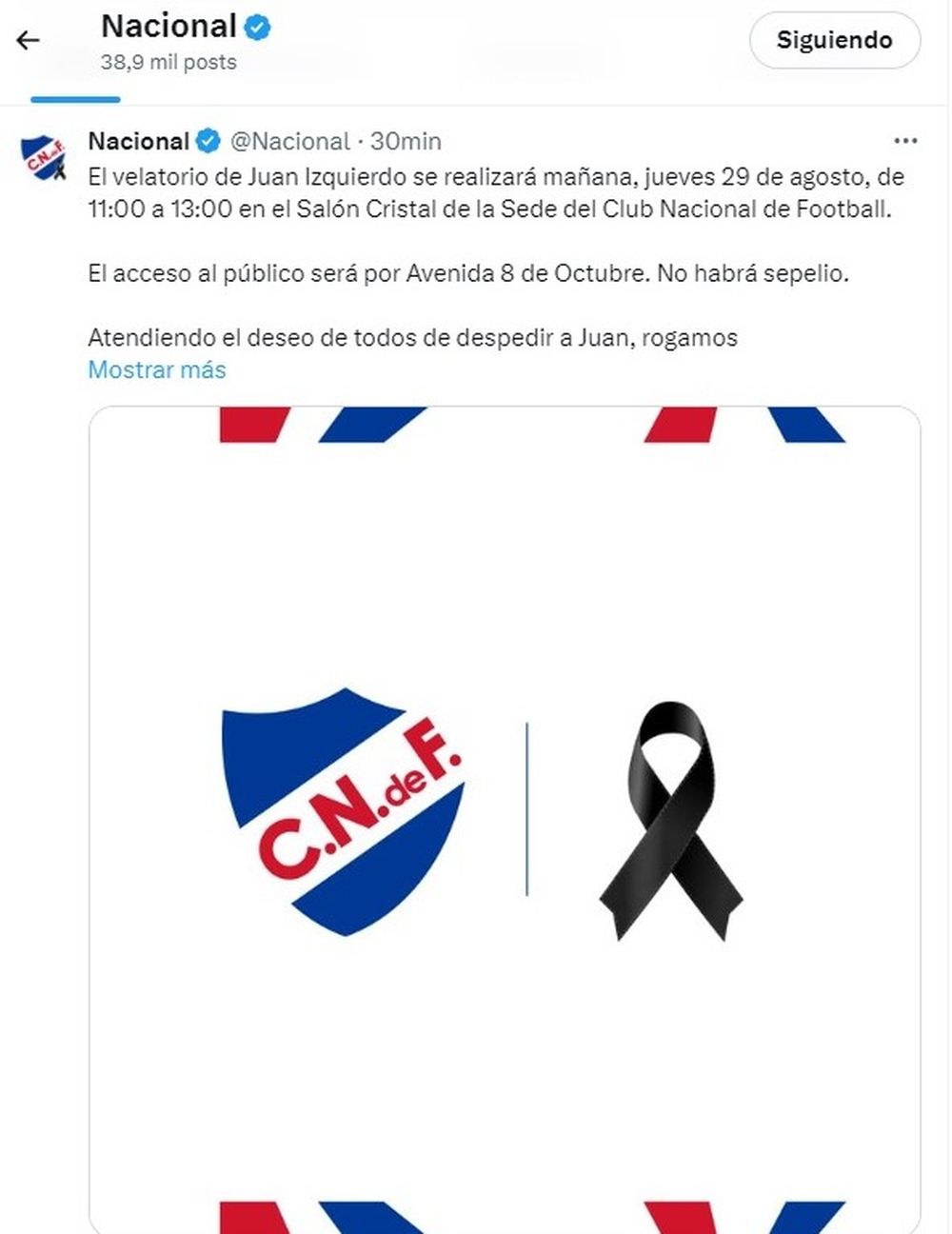 El velatorio de Juan Izquierdo se realizará este jueves 29 de agosto, de 11 a 13 horas, en el Salón Cristal de la sede del Club Nacional de Football. El acceso al público será por Avenida 8 de Octubre. El club señala que no habrá sepelio y por tanto, se ruega que la circulación por el salón se realice con fluidez y orden, respetando el protocolo.